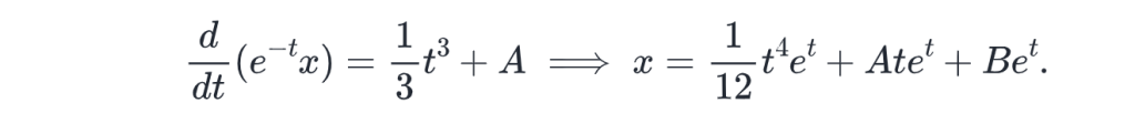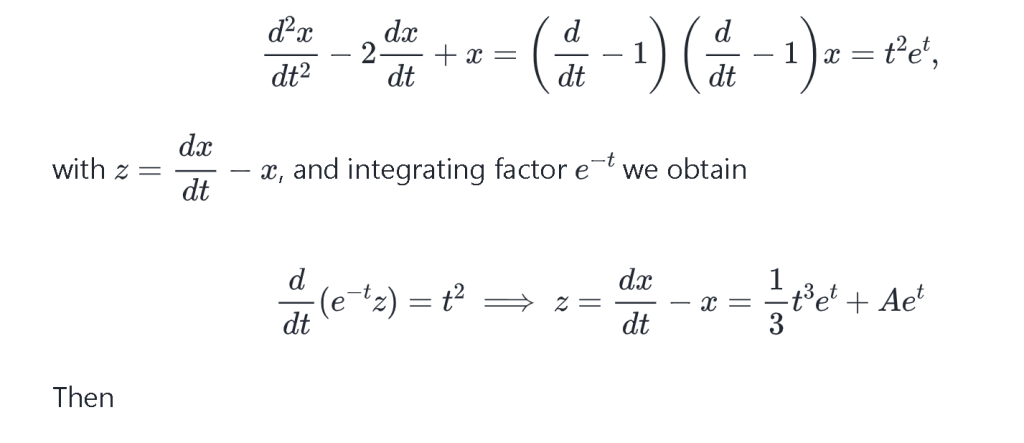 For f(x)=..., a good guess for the particular integral is (x猜的特解). Substituting this into the equation gives (代入后的式子). So the general solution is ... Since we know the initial conditions, we can fix A and B , using (题给常数). This gives A=... and B=... . Therefore, ...